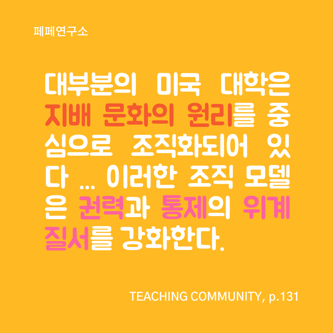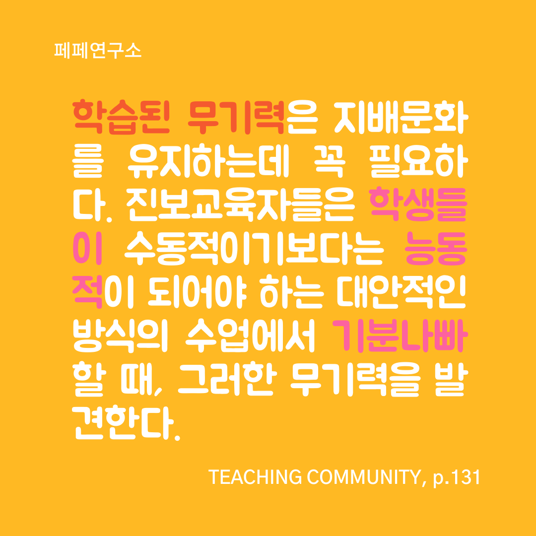 지배 문화, dominator culture. 벨 훅스가 이 책에서 계속해서 많이 말하고 있는 어구다. Dominator가, 자신들의 이익을 위해 만들어 놓은 사회 구조 시스템이 돌아가고 있고, 심지어 '문화'이기도 하다는 것. 지배자 dominator 란 그야말로 억압받는 계층과 대립적인 위치에 있는, 권력자 집단일 것이다. 그런 문화가 학생들에게 학습된 무기력을 심어놓는다. 그래서 학교의 권위주의가 공고히 돌아가도록 하기 위해.