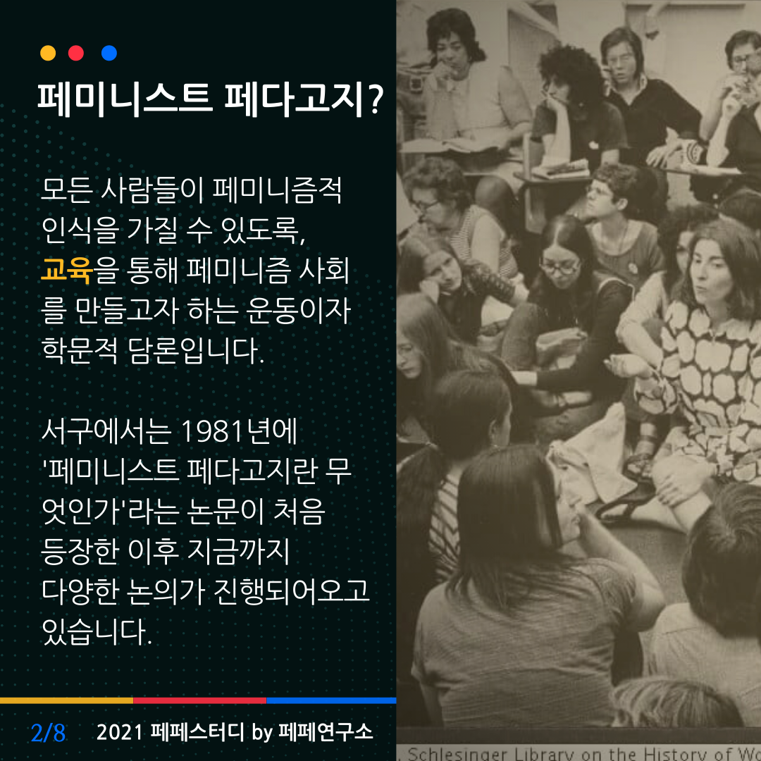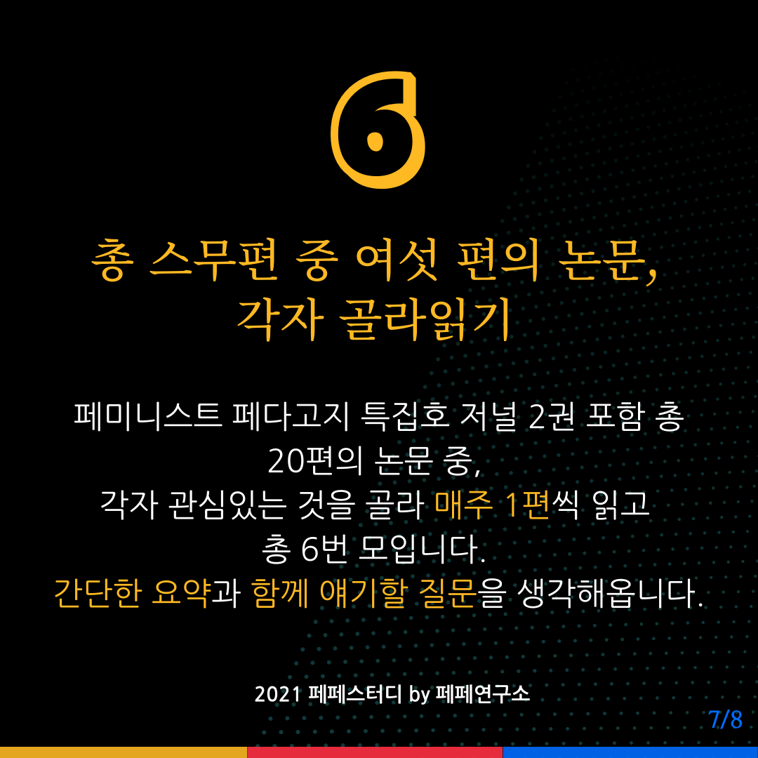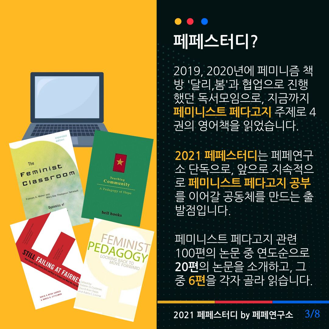장기적으로는 페미니스트 페다고지 공부를 꾸준히 함께 하고, 그러면서 각자의 삶의 자리, 각자의 교육 실천의 자리에서의 고민과 변화를 함께 논의할 수 있는 공동체를 꿈꾸어 봅니다. 이번에 모집하는 2021 페페스터디는 그 출발점이라고 생각하고 있습니다. 제가 찾은 약 100편의 논문 중 연도순으로 20편의 논문을 소개해드리고, 그 중 각자의 관심사에 따라 각자가 고른 6편의 논문을 읽는 모임입니다.