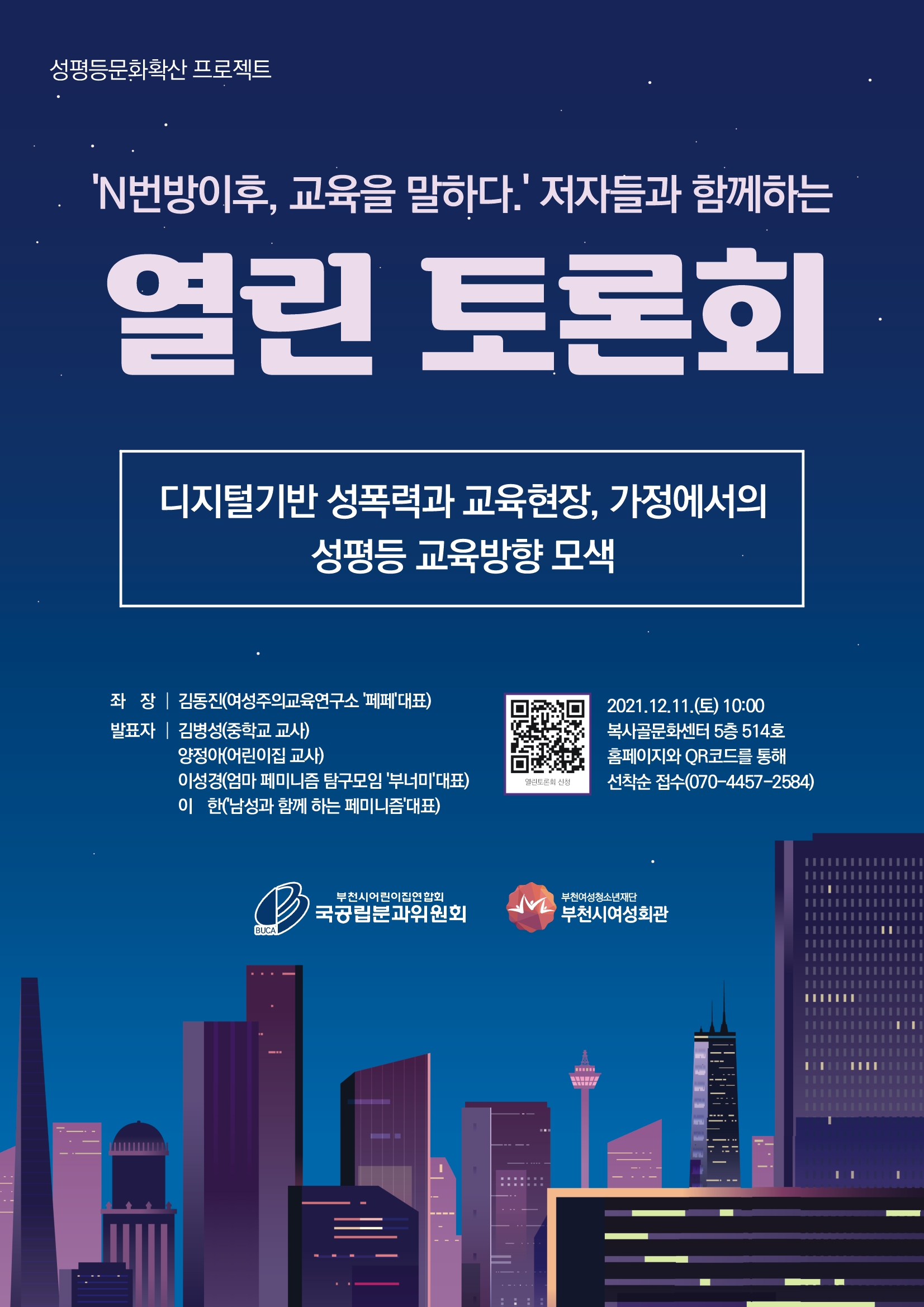 시간이 이렇게 빨리 가는 줄 모르고 이제서야 포스팅하네요. 이번주 토요일 12월 11일 줌(Zoom) 실시간 온라인으로 진행하는 특강입니다. 저는 사회를 맡았고, 저희 'N번방 이후, 교육을 말하다' 저자분들 중에서 김병성, 양정아, 이성경, 이한님과 함께 하는 열린 토론회입니다. 부천시 여성회관에서 주최해주십니다. 텔레그램 N번방 성착취 사건은 여전히 끝나지 않았고, 비슷한, 더 지능적인, 혹은 더 다양한 디지털 성범죄들이 끊이지 않고 있습니다. 책을 출간한지도 1년이 지났는데요, 저희 저자들은 책에서 했던 얘기 이후에 각자의 삶의 자리에서 해오고 있는 실천들을 이야기하고, 참가자분들과 함께 생각해보는 자리를 마련하고자 합니다. 양정아님은 페미니즘과 비거니즘이 만나는 지점에 대한 고민과 비건교사모임에서 해오고 있는 실천에 대해, 성경님은 가정에서 양육자가 할 수 있는 실천에 대해, 한님은 페미니즘으로 남성과 함께 바꿔가는 세상에 대한 고민과 실천에 대해, 병성님은 학교에서 해오고 계신 실천에 대해 각각 발표할 예정입니다. 또한 부천시에서 활동하고 계신 분들 2분도 토론자로 모십니다.