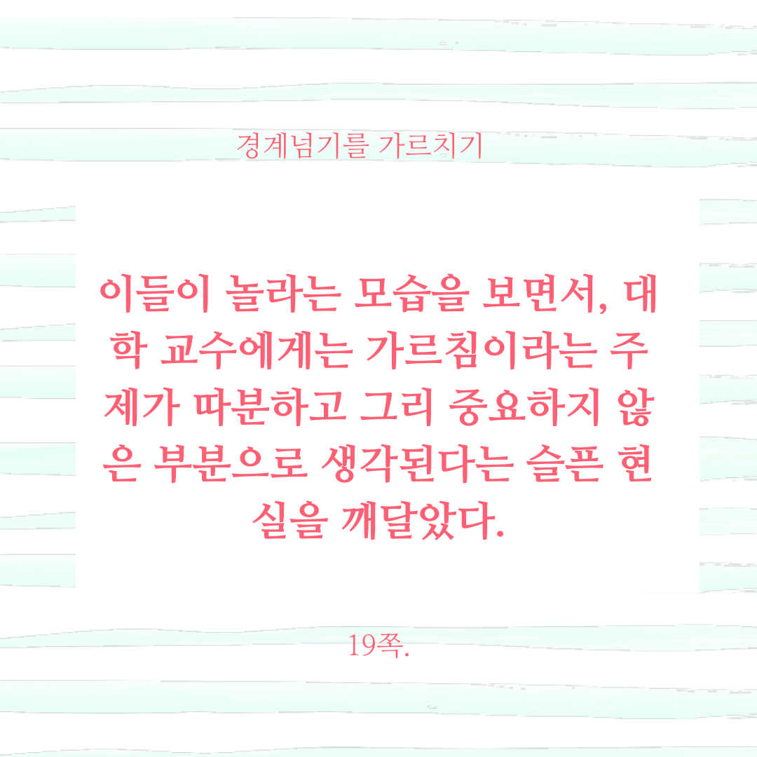 대학의 강의실에서 본인이 어떻게 가르치는지에 관해, 강의실에서 일어나는 일들에 관해 "상세하고 깊이있게" 이야기하는 대학 교수/강사들은 많지 않다. 대학 교수들의 직업경로에서 수업이란, 특별히 못 했을 때 벌점으로나 반영될만한 것이다. 연구를 하고 논문을 쓰는 것이 승진의 기준점이다. 전통적인 커리어 트랙에서 강사들은 대체로, 대학에서 하는 강사 생활을 어딘가 더 좋은 곳으로 가기 위한 발판으로 여긴다. 박사학위를 받은 후 대학에 교수로 취업할 때까지, 혹은 연구소에 정규직 연구원으로 취업할 때까지, 이력서를 채워야 해서 하는 일쯤으로. 그런 시스템이다.