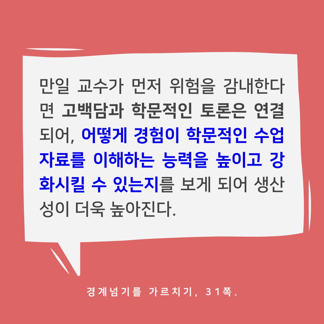 생각해보면 다른 페미니스트들에 대해서는 그들의 학문적인 주장이나 운동에의 실천 말고도 개인사를 알게 되었을 때 더 감명받았던 적도 있는데, 나는 강의실에서 나 자신을 드러내고 "상처입는 연습"을 하려고 생각해본 적은 없는 것 같다. 내 인생이 별 거 아니라고 생각해서 그랬던 것 같기도 한데, 그런 나의 소심함과는 별도로 수업에서의 자기개방에 관한 이 구절이 오늘 특히 눈길을 끈다.