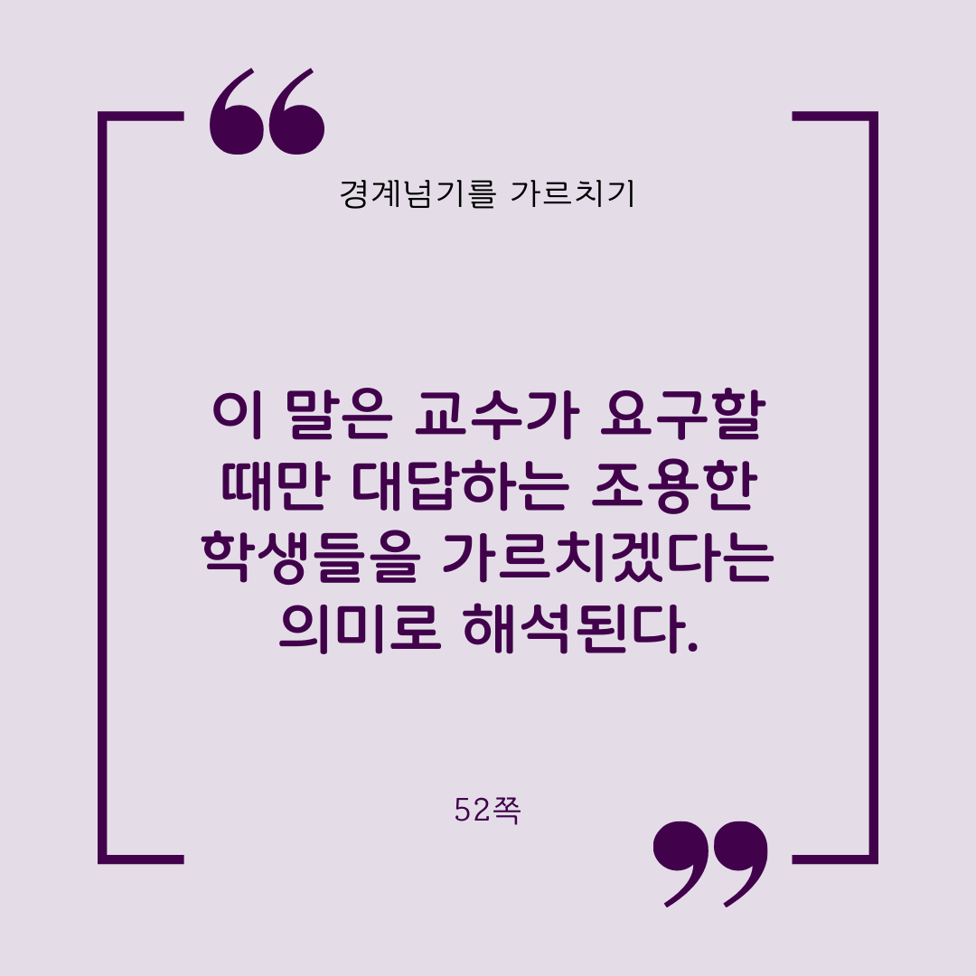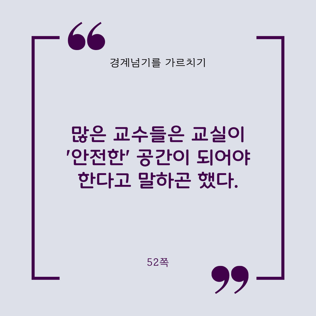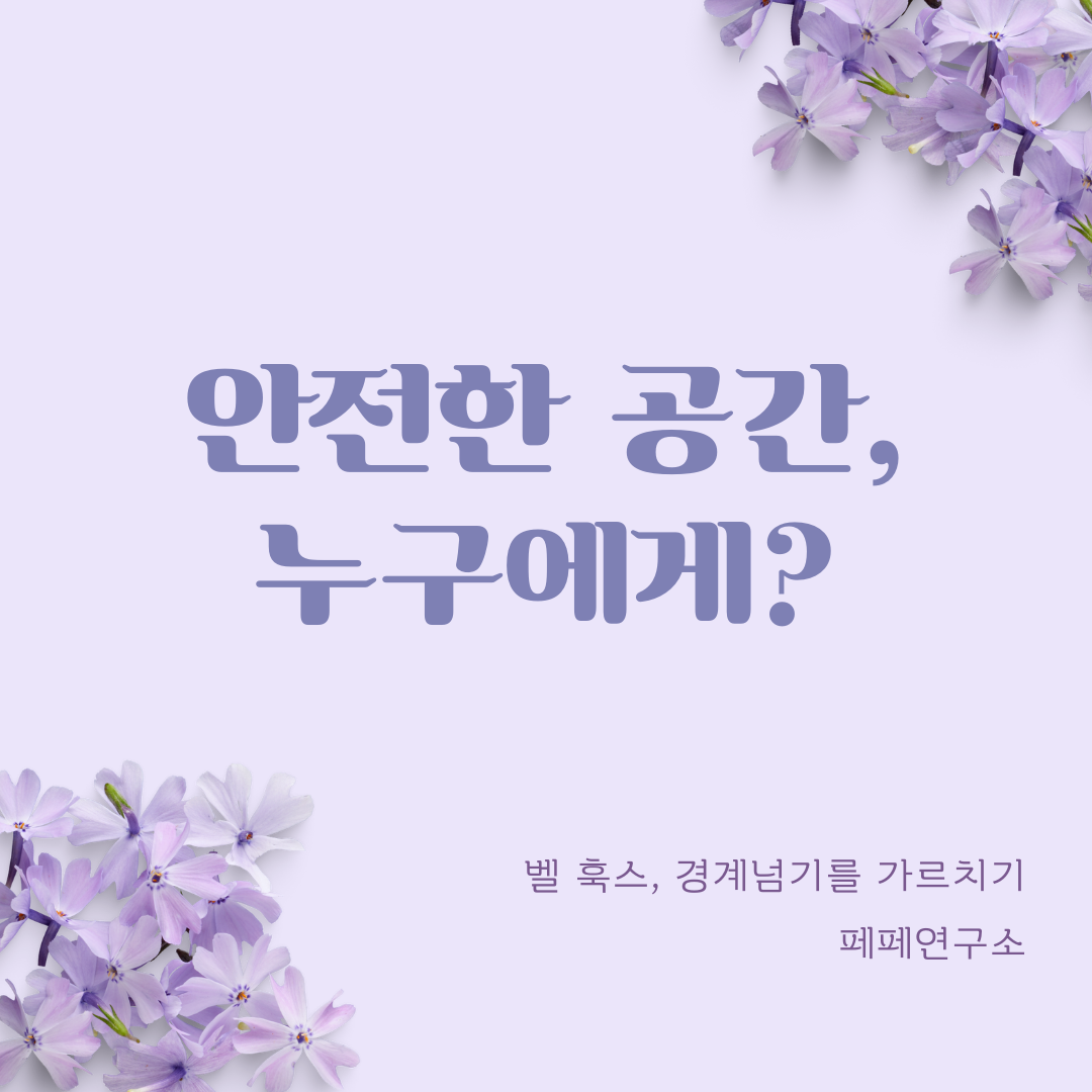 일단은 '많은' 교수들이 교실이 안전한 공간이 되어야 한다고 말한다는 것도 약간 충격이다. 미국이라 그런건가? 근데 벨 훅스의 일침은 그 때의 안전한 공간이란, 교수들에게 안전한 공간을 의미한다는 것이다. 학생들의 질문으로 도전받을 필요도 없고, 해결할 갈등도 없는, 본인이 준비한 바를 떠들고 나가면 되는 그런 안전한 공간. 하지만 교수의 관점에서 안전해보이는 공간도 학생들, 특히 어떤 특정 계층의 학생들에게는 안전하지 않다는 이야기. 특히 '유색인' 학생들이 안전함을 느끼지 못한다는 구절은 특히 '여'학생들로 바꾸어 생각해볼 수 있겠다.