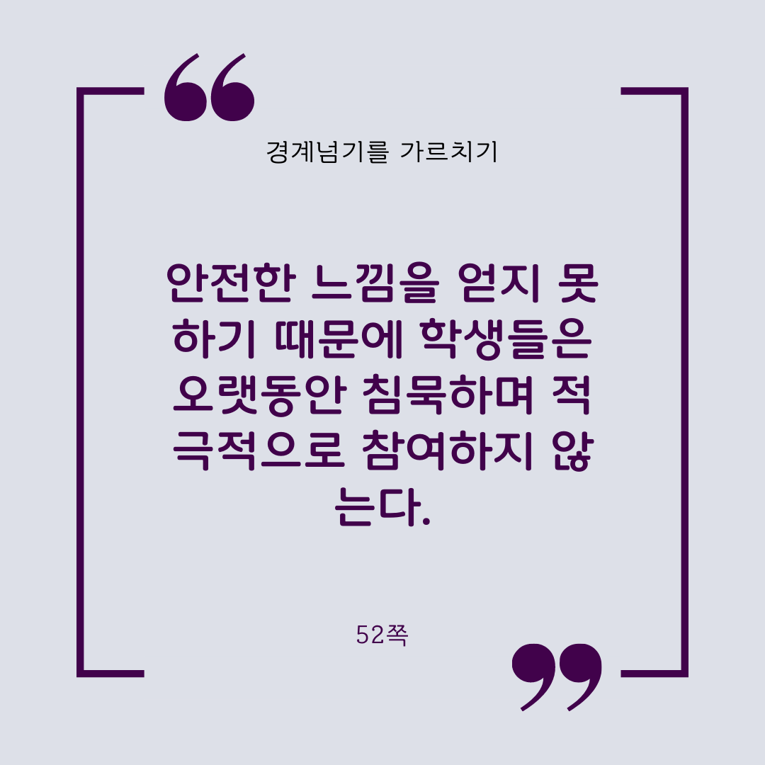 이 다음 페이지에 벨 훅스는 그런 의미에서 안전함보다 더 필요하다고 생각하는 것이 무엇인지도 말한다. "나는 교실이 안전한 곳이어야 한다고 생각하지 않는다. 그보다는 공동체 의식이 바탕이 되어야 공동 참여와 공동 이익이 우리를 하나로 묶어준다고 느끼도록 한다고 생각한다."(p.53) 지금의 환경에서, 강의실을 '공동체'로 만들 수 있을까 강의실을 학습자의 관점에서 '안전한 공간'으로 만드는 것보다 더 어려운 것이 공동체로 만드는 일인 것 같다...