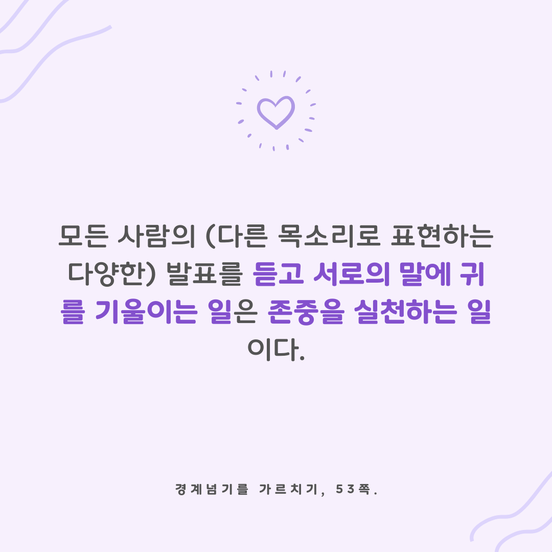 한 번도 안 해본 것을 시도하는 나로서도 조금의 두려움이 있었지만 생각보다 괜찮았던 경험인 듯 해서 얼마 후에는 조금 더 큰 비중을 두고, 그리고 학부 강의를 하게 되자 학부 강의에서도 시도해 보았다. 아직도 기억이 난다. (코로나 이전) 40여명 정도 되던 강의실에서 마른 몸으로 나와 앞에 서서 자신의 섭식장애에 관한 글을 읽으며 눈물을 쏟던 A. 편의점에서 알바 하다가 스토킹 당했던 경험을 이야기할 때 목소리와 몸이 떨리던 B. 그런 B와 함께 그룹으로 둘러앉아 서로 공감하며 비슷한 경험을 쏟아내던 C와 D와 E 등등 모두들. 서로가 서로의 목소리를, 그 다양한 목소리로 하는 이야기를 듣는 것만으로도 '존중의 실천'이라고 벨 훅스는 말한다.