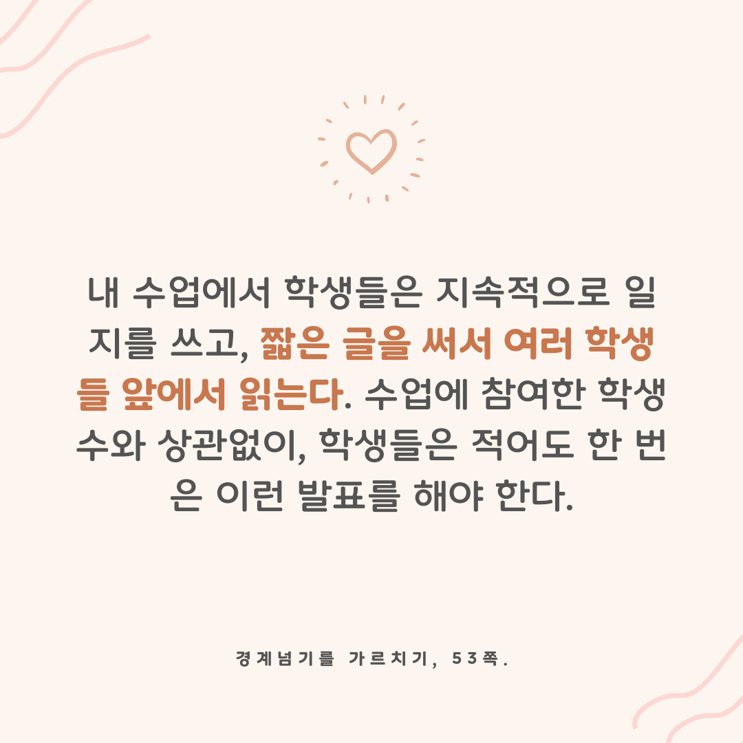오래 전 이 책을 읽으며 바로 이 부분에 꽂혀서, 그로부터 얼마 후 내가 하는 강의에서도 항상 학생들이 글을 써오게 해서 그 글을 수업에서 읽도록 해왔다. 나도 처음 시도해보는 거라서 처음에는 대학원 수업에서 조심스럽게, 점수에 크게 영향을 주지 않는 배점 내에서 시도했다. 다만 이 때의 글이 수업의 내용에 관한 학술적인 글이 아니라, 무엇이든 본인 주변에서 최근에 본인이 관심갖고 있는 바에 대해 약간 조사해서 자신의 생각을 쓰도록 했다. 그 글을 수업에서 읽으면 그 내용에 대해 다같이 토론했다.
