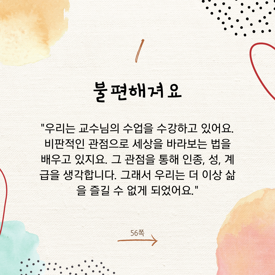 구체적인 전략이 없는 것 같아 보이지만 잘 들여다보면 벨 훅스가 했던 일들 중에서 이것저것 가르칠 때의 힌트를 얻을 수 있다. 비판적 사고를 하게 될수록, 사회 구조의 부조리를 보게 될수록, 일상의 모든 것이 불편해진다. 지난학기 수강생 중 한 명도, 늘 편안하게 보던 각종 미디어들이 조금씩 불편해지기 시작했고 생각하며 보게 되었다고 했다.