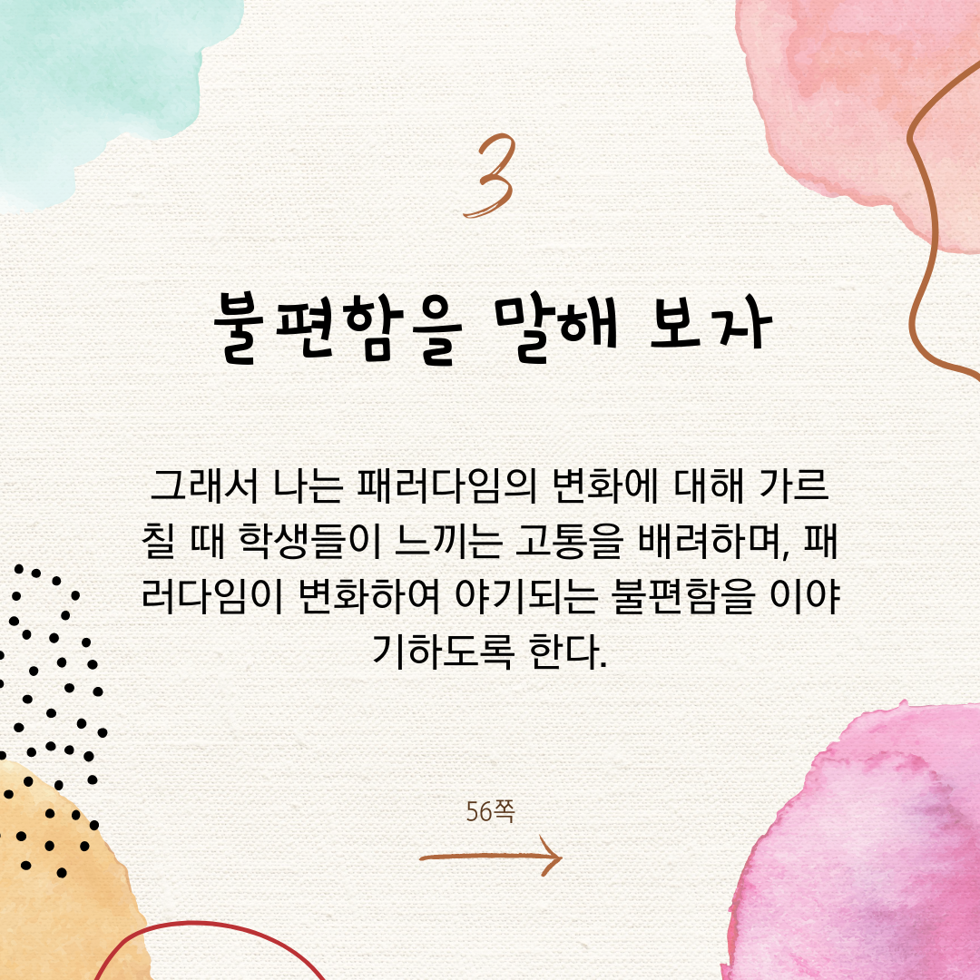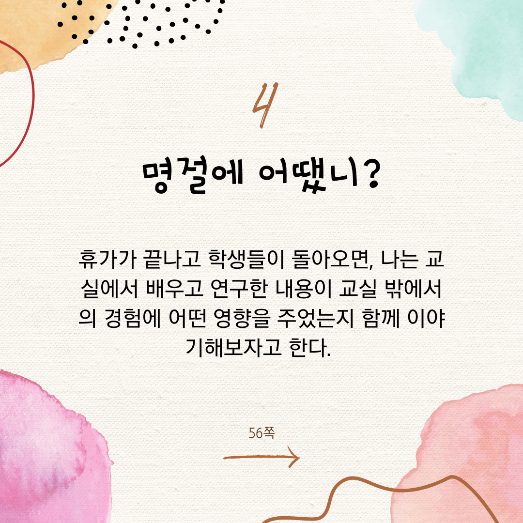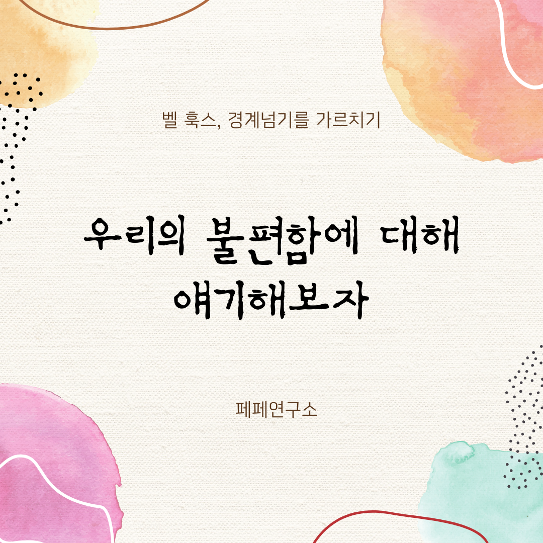 벨 훅스가 한 것은 그 불편함까지도 강의실에서 이야기할 수 있는 판을 깔아준 것이다. 특히 명절, 여기서는 휴가(holidays)라고 했지만 우리나라로 치면 연휴나 명절에 버금가는 것도 holiday라고 하니까. 아무튼 우리나라로 치면 명절에 집에 다녀와서 어땠니? 하고 물어보는 거다. 그러면 아마도 그 동안 당연시했던 성별 불평등한 명절 가사노동을 관찰 혹은 경험한 바를 학생들이 이야기하겠지.