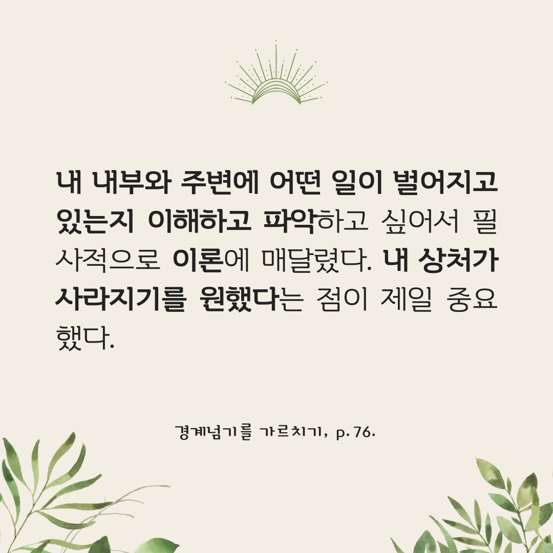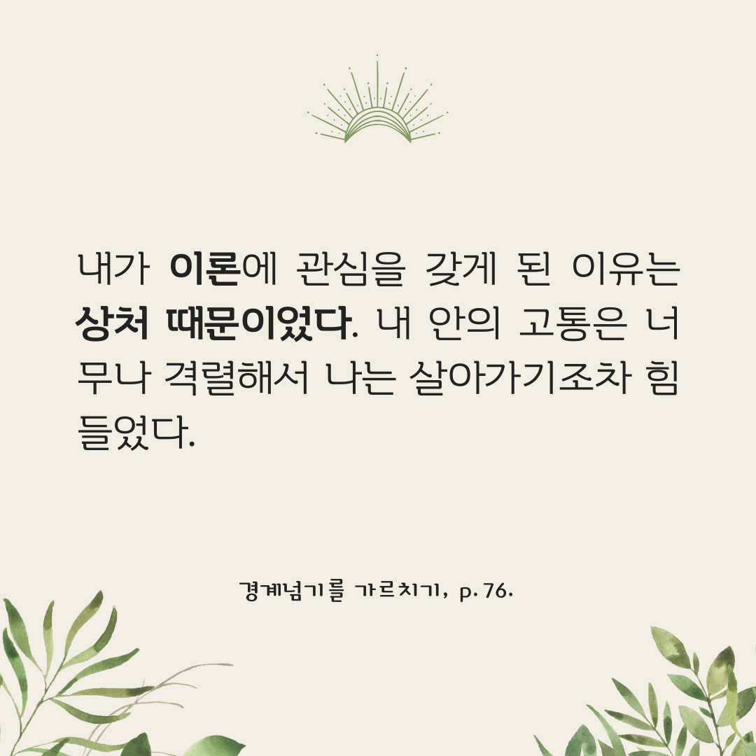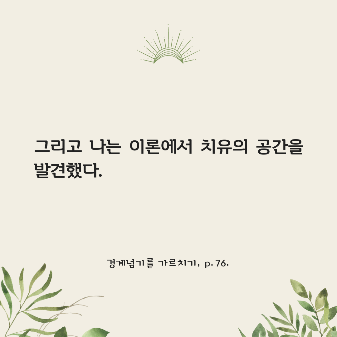 미국에서 공부하면서 어렴풋이, 이론과 일상을 연결하는 일에서 공부의 재미를 느끼고 돌아왔다. 하지만 그런 몇 년 간의 경험이 배움에 관한 나의 근본적인 생각이나 습관을 바꾸지는 못했다. 오히려 나를 바꾼 건 바로 이 구절이었다. "그리고 나는 이론에서 치유의 공간을 발견했다."(p.65)